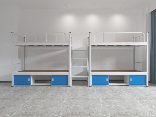 圖三中所示為帶床底柜的雙層鐵床,它與上邊幾種宿舍床的區(qū)別就在于多了一個儲物空間,將原本床底空出來的部分安置上了柜子,這樣無論是行李箱還是衣物,都可以放置其中,另還將原先的爬梯改造成了一個踏板樓梯,使它的安全性提高了不少。